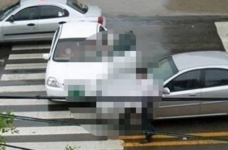 한 여성이 차를 타고 횡단보도를 건너다 접촉사고를 낸 것으로 추정되는 장면을 담은 사진이다. 인터넷에 퍼져 있는 \'김 여사\' 사진 중 하나다.